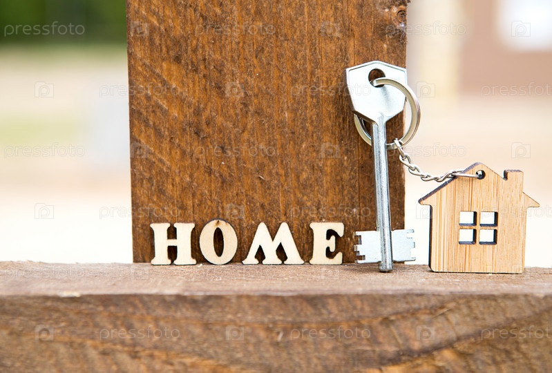 Брелок деревянного фигурного дома на заборе с ключом и надписью английскими буквами «дом». Коттедж на заднем плане. Строительство, проект, переезд в новый дом, ипотека, аренда и покупка недвижимости