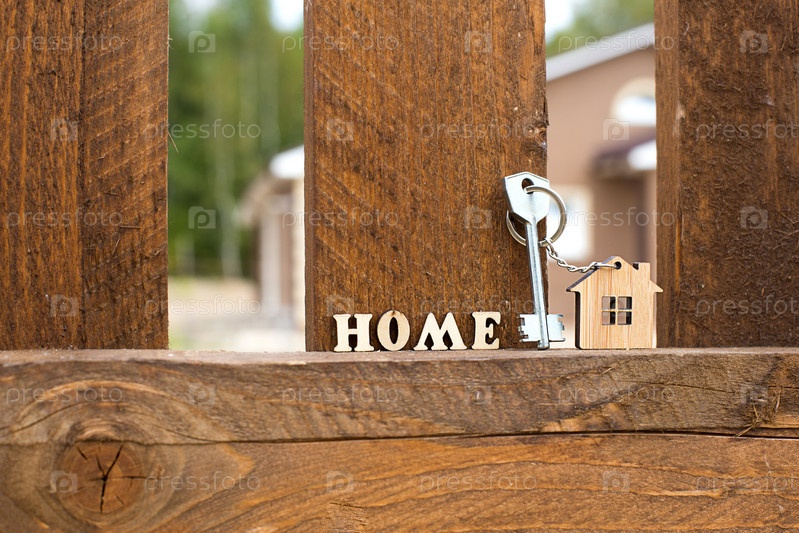 Брелок деревянного фигурного дома на заборе с ключом и надписью английскими буквами «дом». Коттедж на заднем плане. Строительство, проект, переезд в новый дом, ипотека, аренда и покупка недвижимости