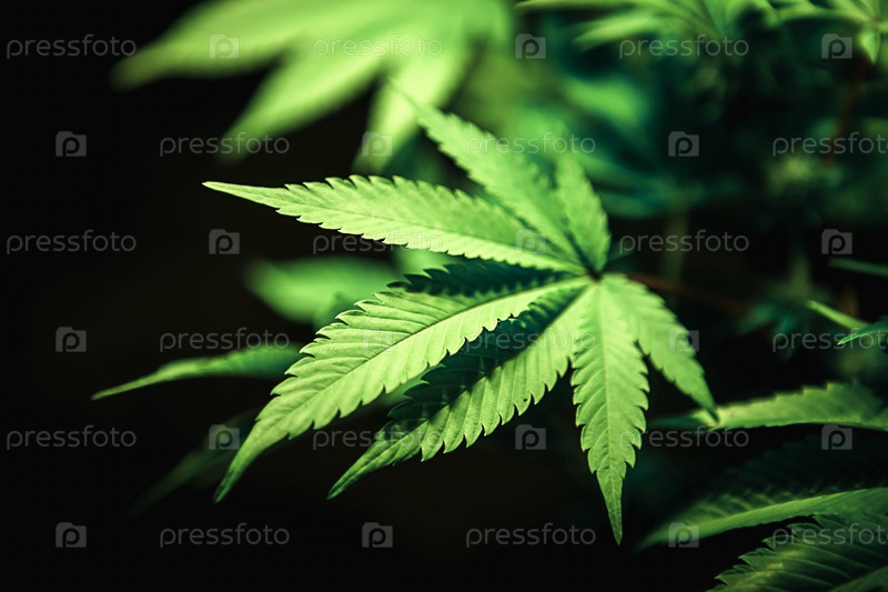 Зеленый лист конопли крупным планом на черном фоне с солнечным лучом и свечением