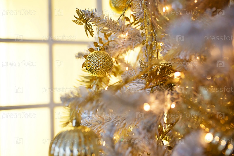 Золотые рождественские украшения на белой искусственной ели крупным планом. Праздничный фон, новый год. Окно с желтым светом. Место для текста