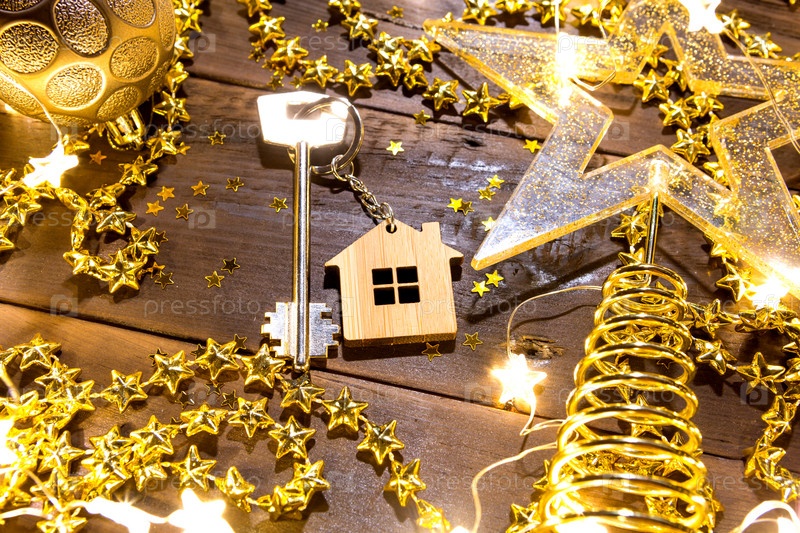 Ключ от дома с брелком на праздничном фоне с блестками, звездами, огнями гирлянд. С Новым годом-деревянные буквы, поздравления, открытки. Покупка, строительство, переезд, ипотека