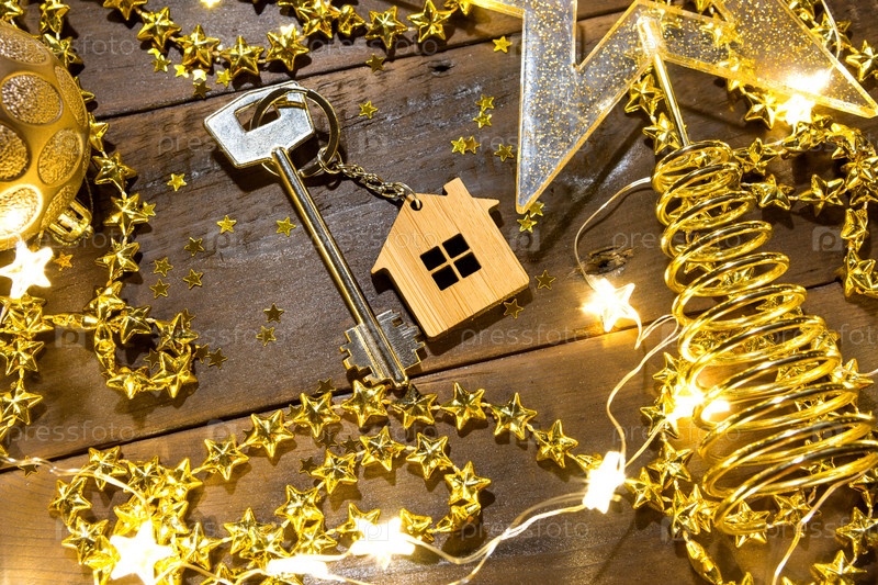 Ключ от дома с брелком на праздничном фоне с блестками, звездами, огнями гирлянд. С Новым годом-деревянные буквы, поздравления, открытки. Покупка, строительство, переезд, ипотека