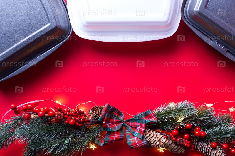 Рождественский декор контейнеров службы доставки еды. Предновогодняя акция. Готовый горячий заказ, одноразовая пластиковая и бумажная упаковка. Работа по организации питания в праздничные дни