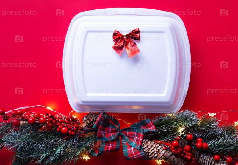 Рождественский декор контейнеров службы доставки еды. Предновогодняя акция. Готовый горячий заказ, одноразовая пластиковая и бумажная упаковка. Работа по организации питания в праздничные дни