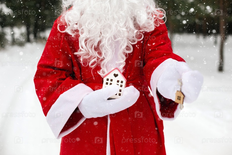 Ключ от дома с брелком в руках Санта-Клауса на открытом воздухе в снегу. Сделки с недвижимостью, покупка, строительство, переезд, ипотека. Уютный дом. С Рождеством, новогодним бронированием и залом