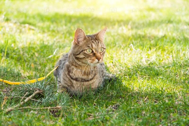 Выгуливание домашней кошки на желтой шлейке. Полосатый кот боится улицы, прячется в зеленой траве с опаской и любопытством