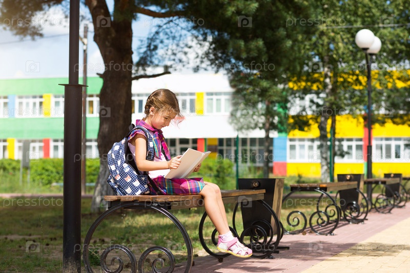 Девушка с рюкзаком сидит на скамейке и читает книгу возле школы. Снова в школу, расписание уроков, дневник с оценками. Образование, классы начальных классов, 1 сентября