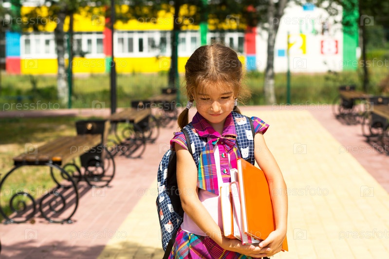 Девушка с рюкзаком и стопкой книг возле школы. Снова в школу, ребенок устал, тяжелые учебники. Образование, начальные классы, начало учебного года, 1 сентября