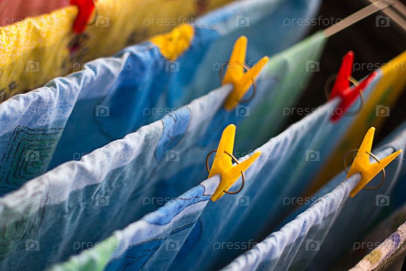 Красочное чистое постельное белье и полотенца после стирки вешают на решетку сушилки и закрепляют желтыми и красными прищепками. Генеральная уборка, Сушка белья, компактная сушилка для дома