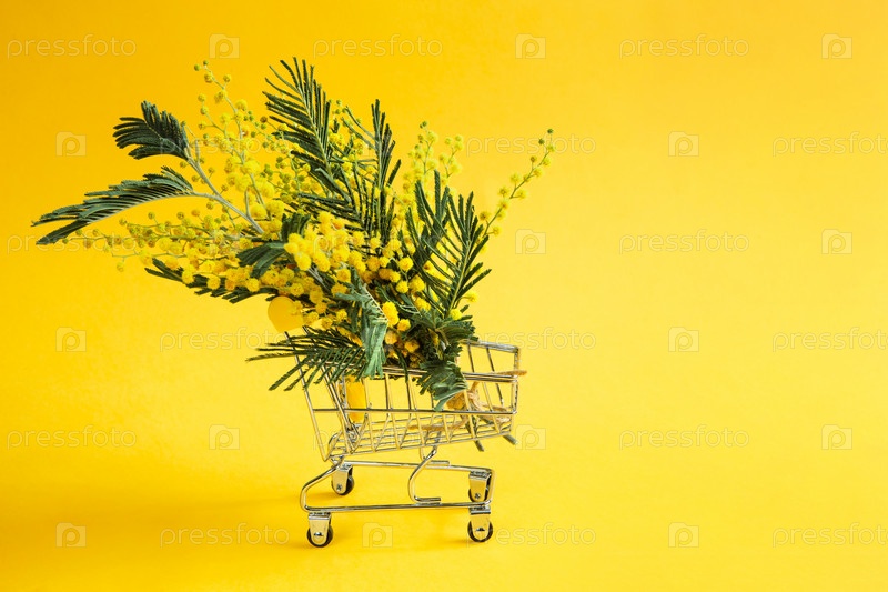 Желтый букет мимозы в тележке супермаркета. Покупка подарка к Международному женскому дню, празднику Весны, 8 марта, Пасхе
