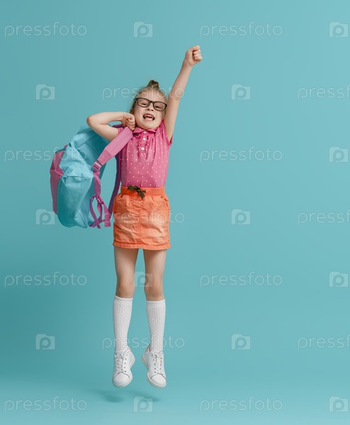 Малышка с рюкзаком на цветном фоне
