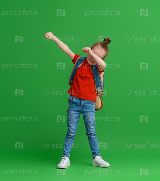 Малыш с рюкзаком на цветном фоне
