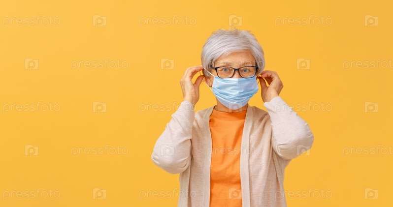 Пожилая женщина в маске во время вспышки коронавируса и гриппа. Защита от вирусов и болезней, домашний карантин. COVID-2019