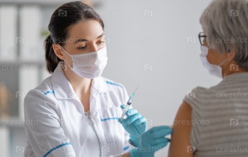 Врач делает прививку пожилой женщине