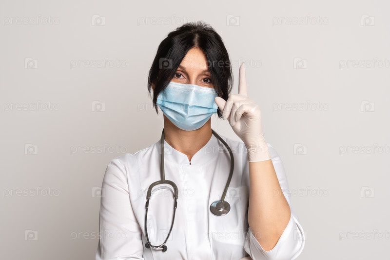 Женщина врач со стетоскопом на сером фоне. Портрет серьезной женщины-врача в медицинской маске на лице и белом халате. Доктор поднимает указательный палец вверх и говорит Внимание, пожалуйста
