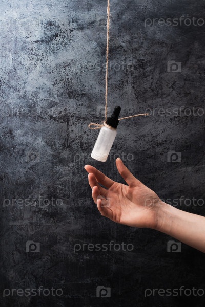 Бутылка косметического продукта рядом с человеческими руками на темном фоне. Вертикальное фото, постер. Скопируйте пространство. Концепция органической косметики без отходов в многоразовом контейнере