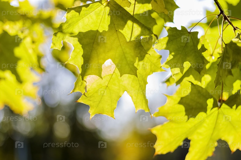 Зеленые кленовые листья на осеннем солнце