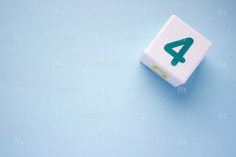 Фотография крупным планом белого пластикового куба с зеленой цифрой 4 на синем фоне в правом верхнем углу. С копией пространства