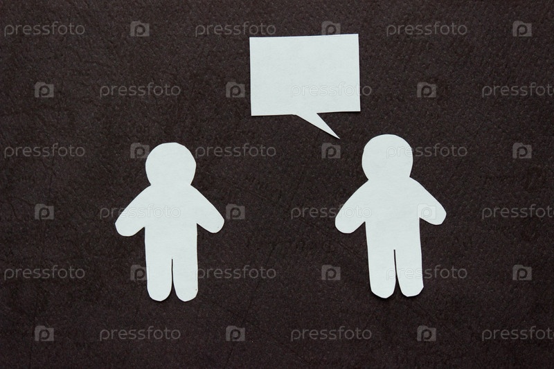 Силуэты двух человек вырезаны из белой бумаги на черном фоне. Люди стоят друг напротив друга, один из них говорит (речевой пузырь). Коммуникация, лидерство, партнерство, командная работа и т.д