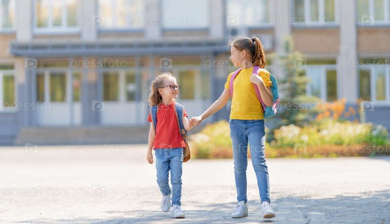 Девочки с рюкзаком идут в школу