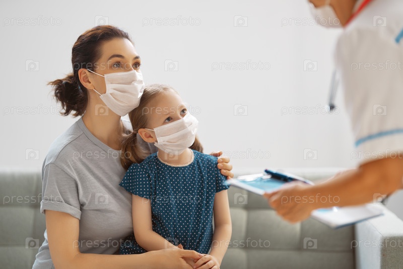 Врач, ребенок и мать в масках