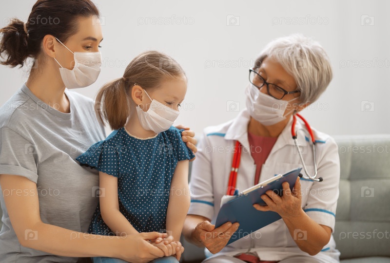 Врач, ребенок и мать в масках