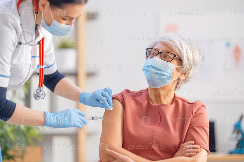 Врач делает прививку пожилой женщине