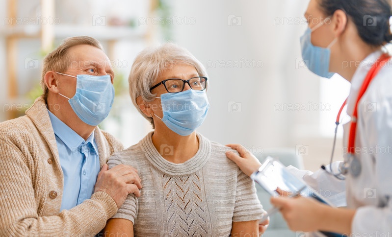 Доктор и пожилая пара в масках