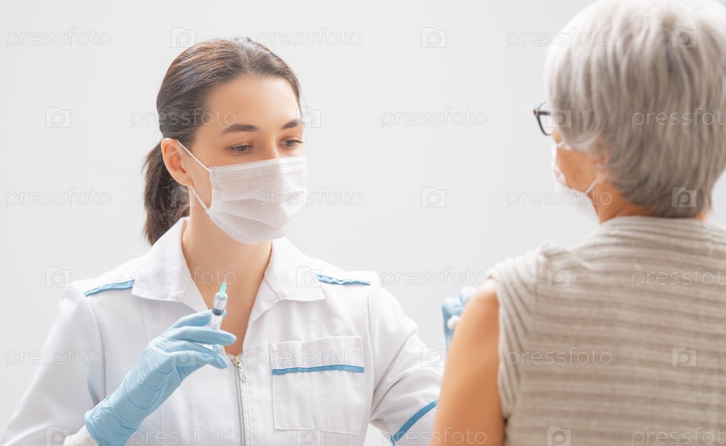 Врач делает прививку пожилой женщине