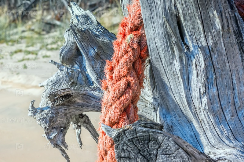 Коряги с веревкой на солнечном песчаном пляже