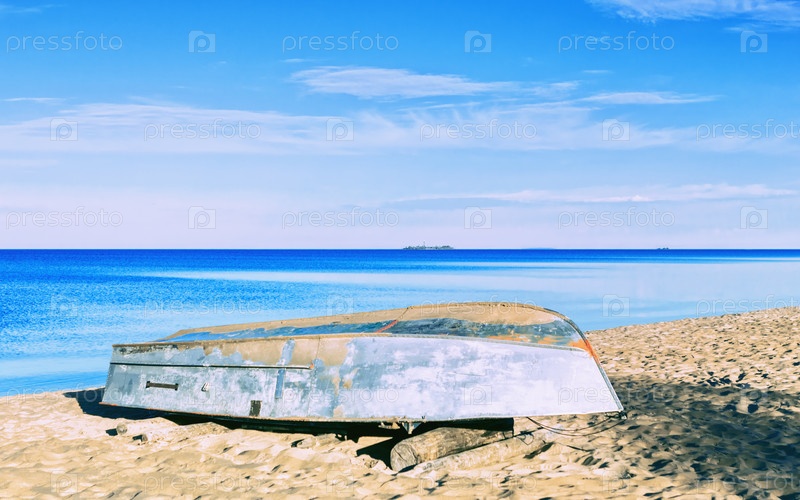 Лодка на песчаном берегу под красивым голубым небом