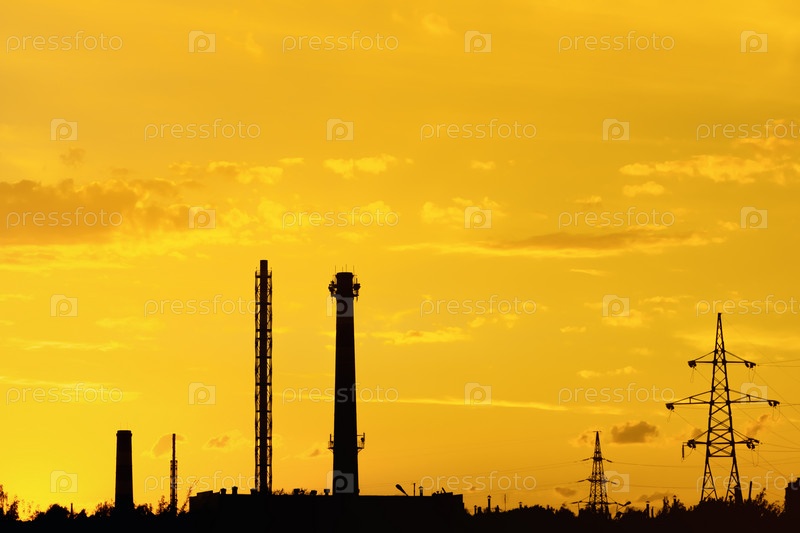 Промышленный пейзаж с силуэтами труб и башен на фоне желтого закатного неба