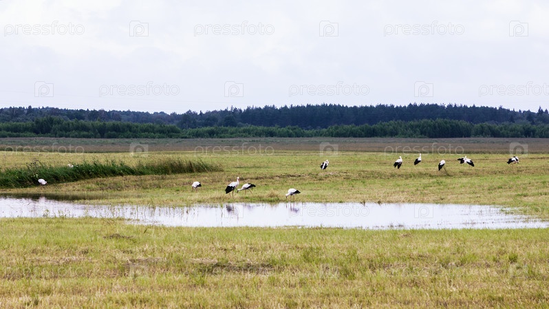 Группа белых аистов вокруг пруда в поле