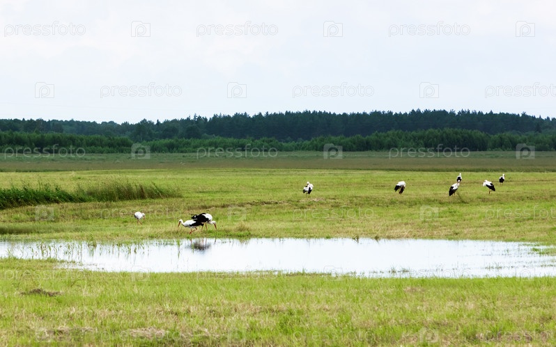 Белые аисты отдыхают у воды на поле в летний день