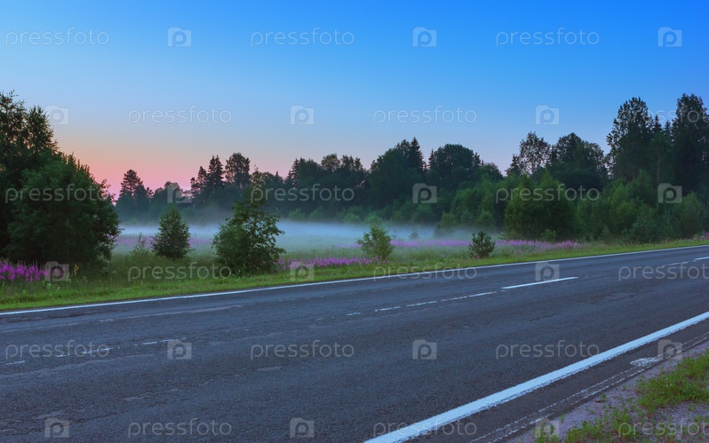 Пустая асфальтированная дорога среди туманных цветущих лугов в утренних сумерках