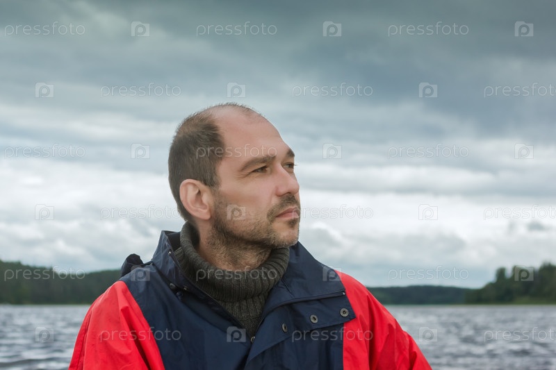 Концептуальный портрет задумчивого бородатого мужчины на фоне пасмурного неба