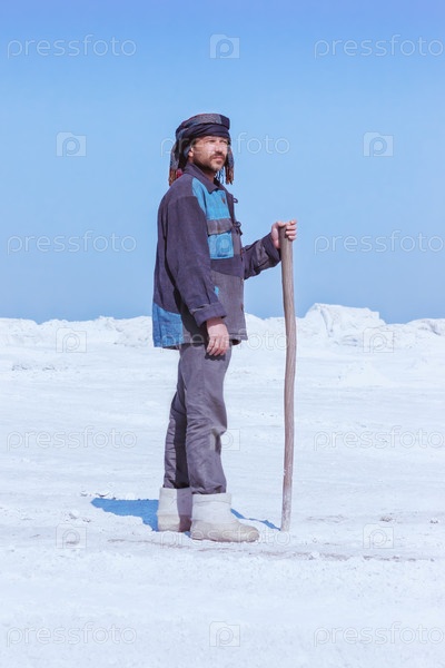 Человек в этнической одежде, стоящий среди белых курганов