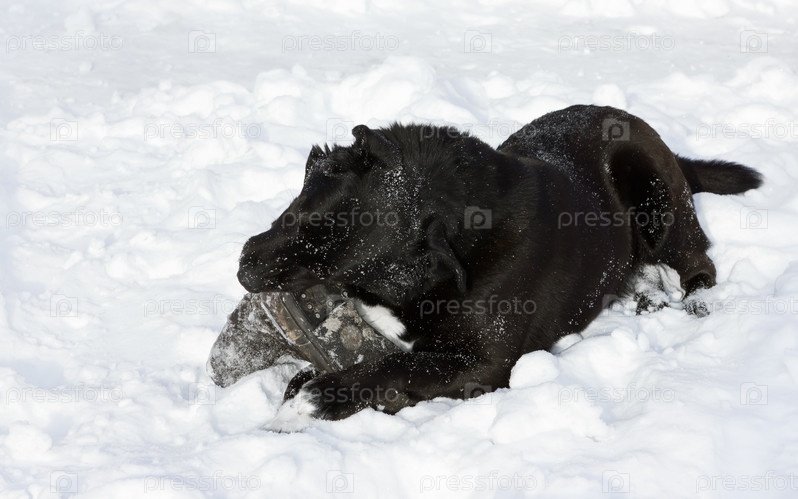 Черная собака грызет старый ботинок, лежащий на снегу