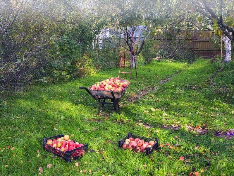 Сбор спелых яблок в деревенском саду