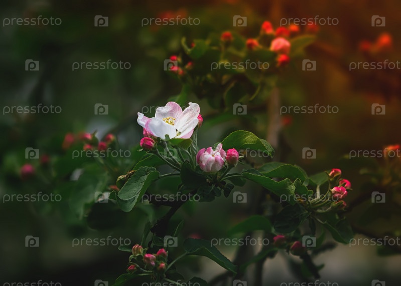 Цветы и бутоны яблони крупным планом в солнечном свете