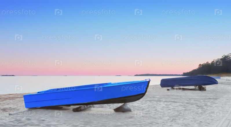 Рыбацкие лодки на пляже на розовом закате