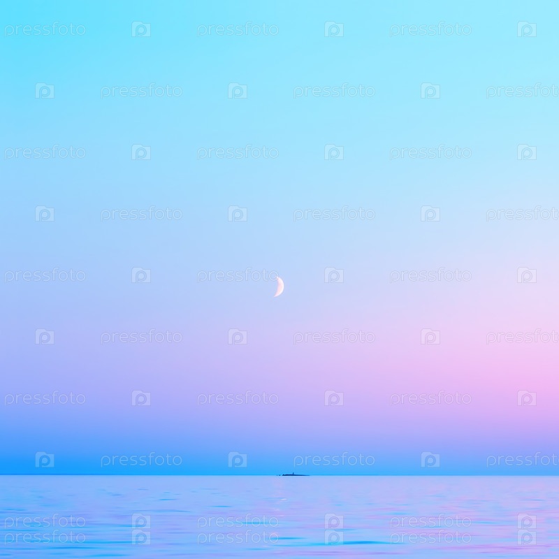 Синий с розовым ночным небом и полумесяцем над морем