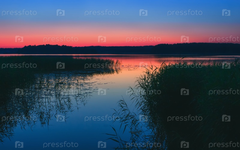 Красивый ночной вид на озеро с тростником после летнего заката. Длинная выдержка, выборочный фокус. Россия, Тудозеро
