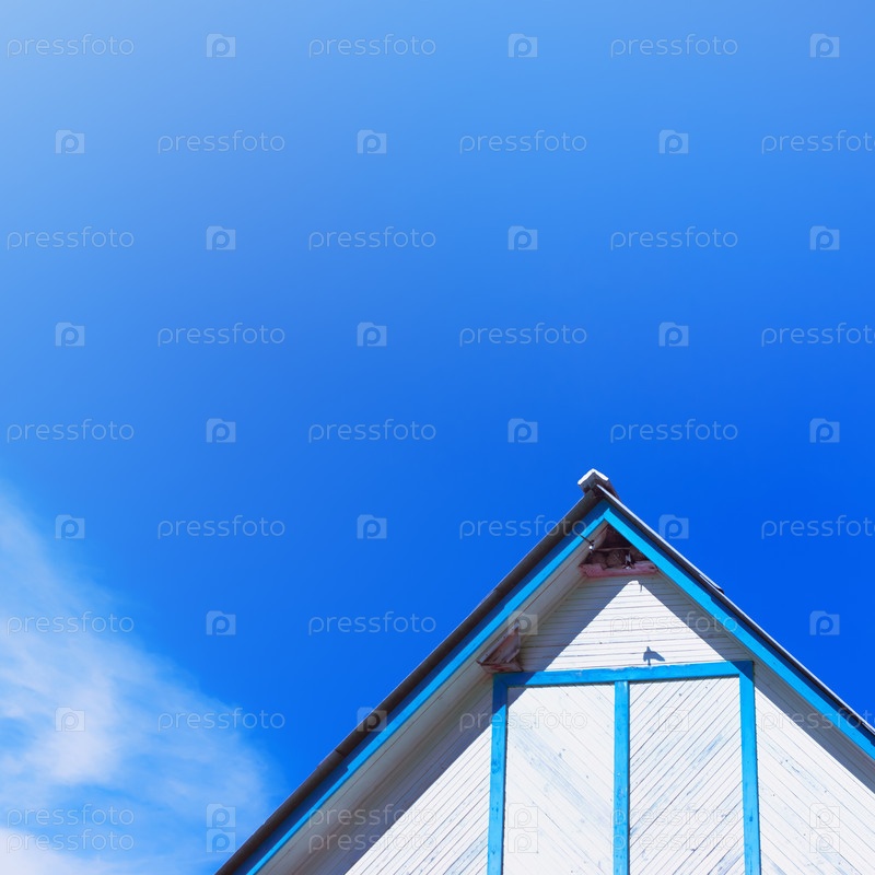 Верхняя часть деревенского деревянного здания с двускатной крышей на фоне неба