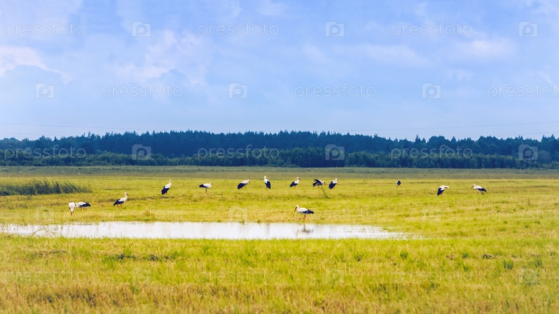 Белые аисты отдыхают на желтом поле в летний день