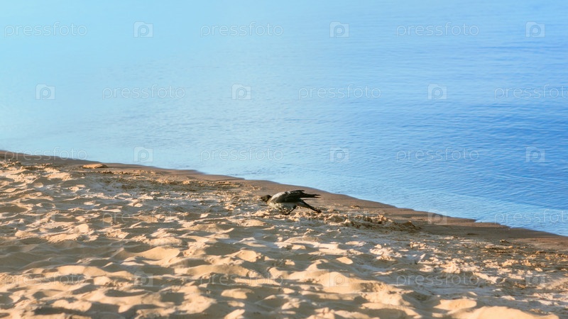 Одна серая ворона ходит по пляжу у воды