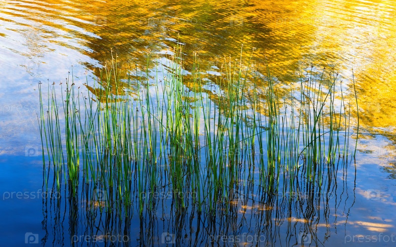 Отражение водных растений и солнечного света в озере