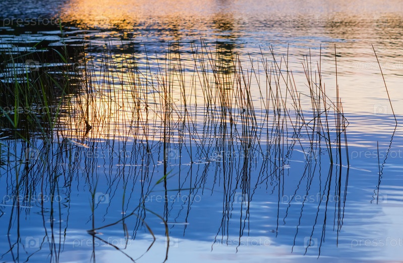 Золотой закат отражается в воде с растущей травой