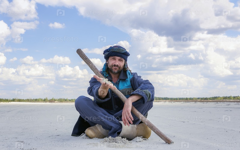 Человек в этнической одежде показывает песок вручную, сидя в пустыне