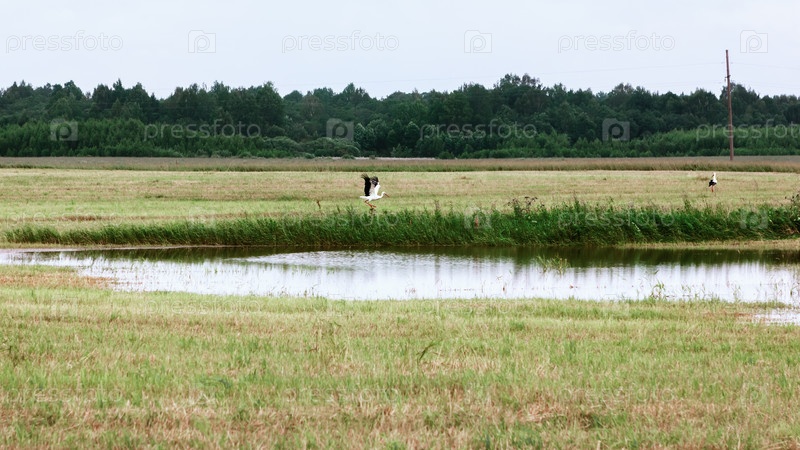 Белые аисты отдыхают у пруда в летний день